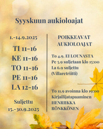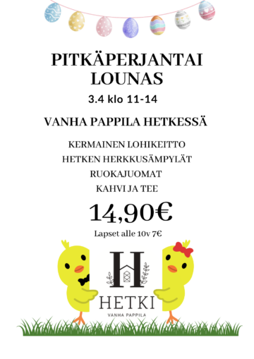 Otamme ulkopuolisia aamiaiselle viikonloppuisin klo 10-11.00, varaukset tulee tehdä etukäteen info@vanhapappilahetki.fi tai 045 6301399, samalla ilmoitukset mahdollisista ruoka-aineallergioista. Aikuiset 16,90 ja alle 7-vuotiaat 8,90€, alle 2 vuotiaat ilmaiseksi.